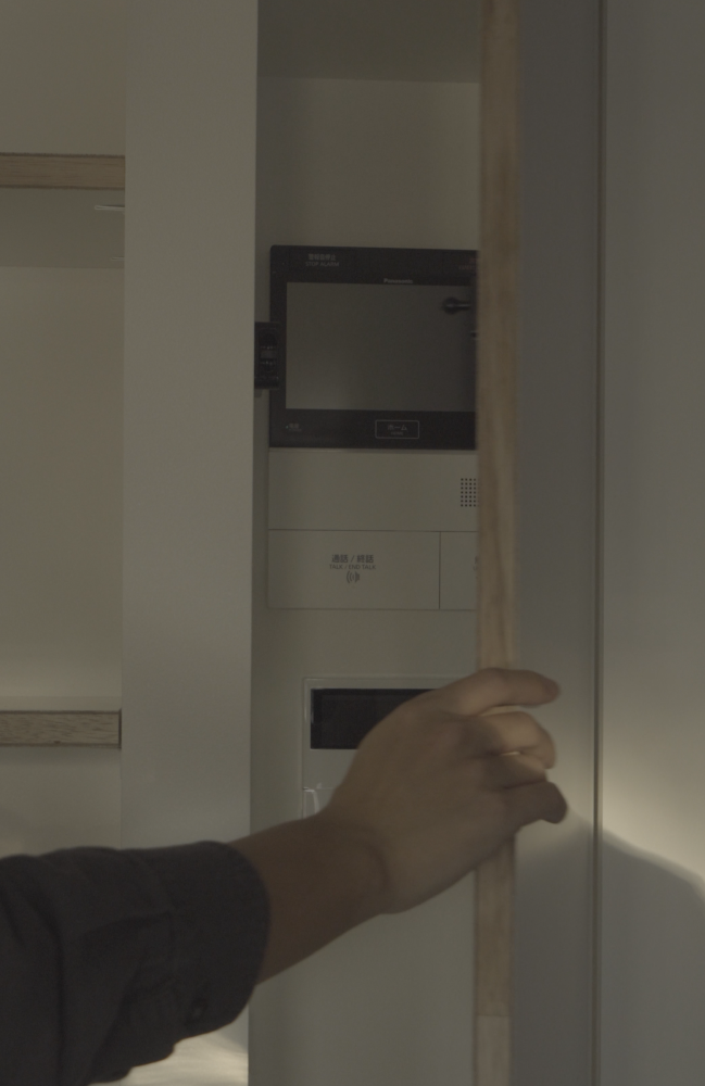 普段は扉を閉じておくことで、壁面はすっきりとした印象に。操作が必要なときだけ扉を押して開き、使い終えたら再び隠すというシンプルな動作で、生活感が表に出にくい空間をつくりました。