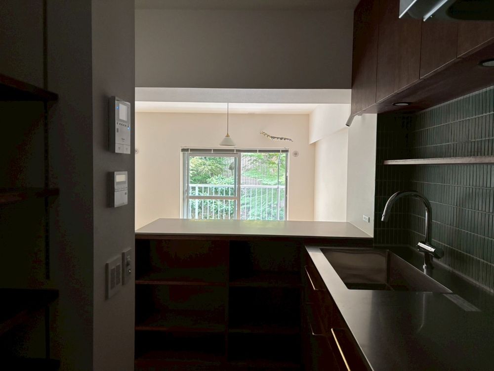 設備を見せないことで、壁が背景として機能し、家具や素材の表情を引き立てます。
