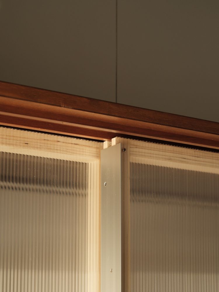 一方で、すべてをラフに仕上げているわけではありません。子ども部屋のグリッド棚や建具まわりは、空間を上品に見せるため、小口テープを貼り、丁寧に仕上げています。ラフさと端正さの使い分けもこの家の大切な設計要素のひとつです。