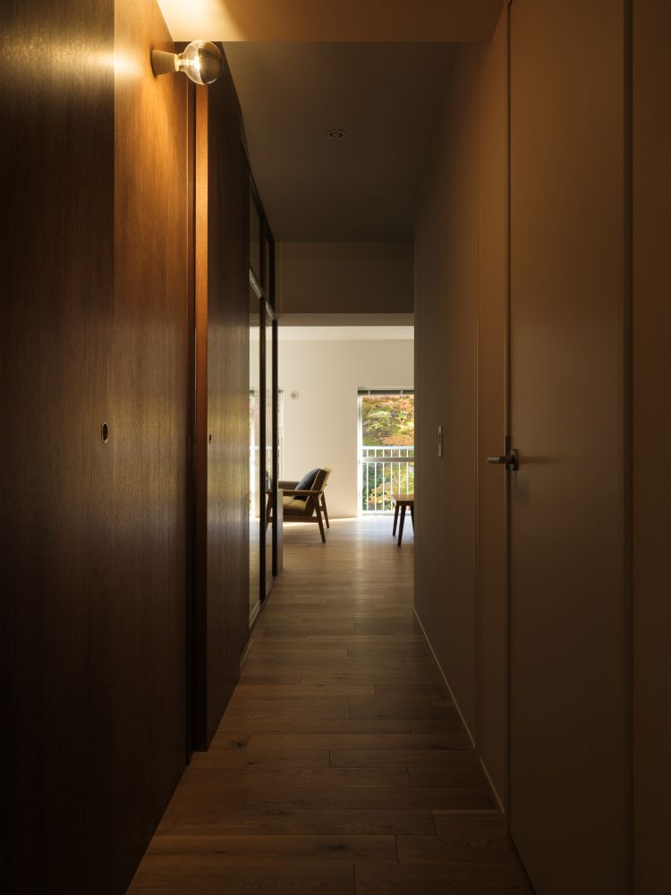 さらに、ガラス間仕切りの一部は開放できる構造とし、廊下との建具も上吊りのガラス引き戸とすることで、住まいの中に光と風の通り道をつくりました。