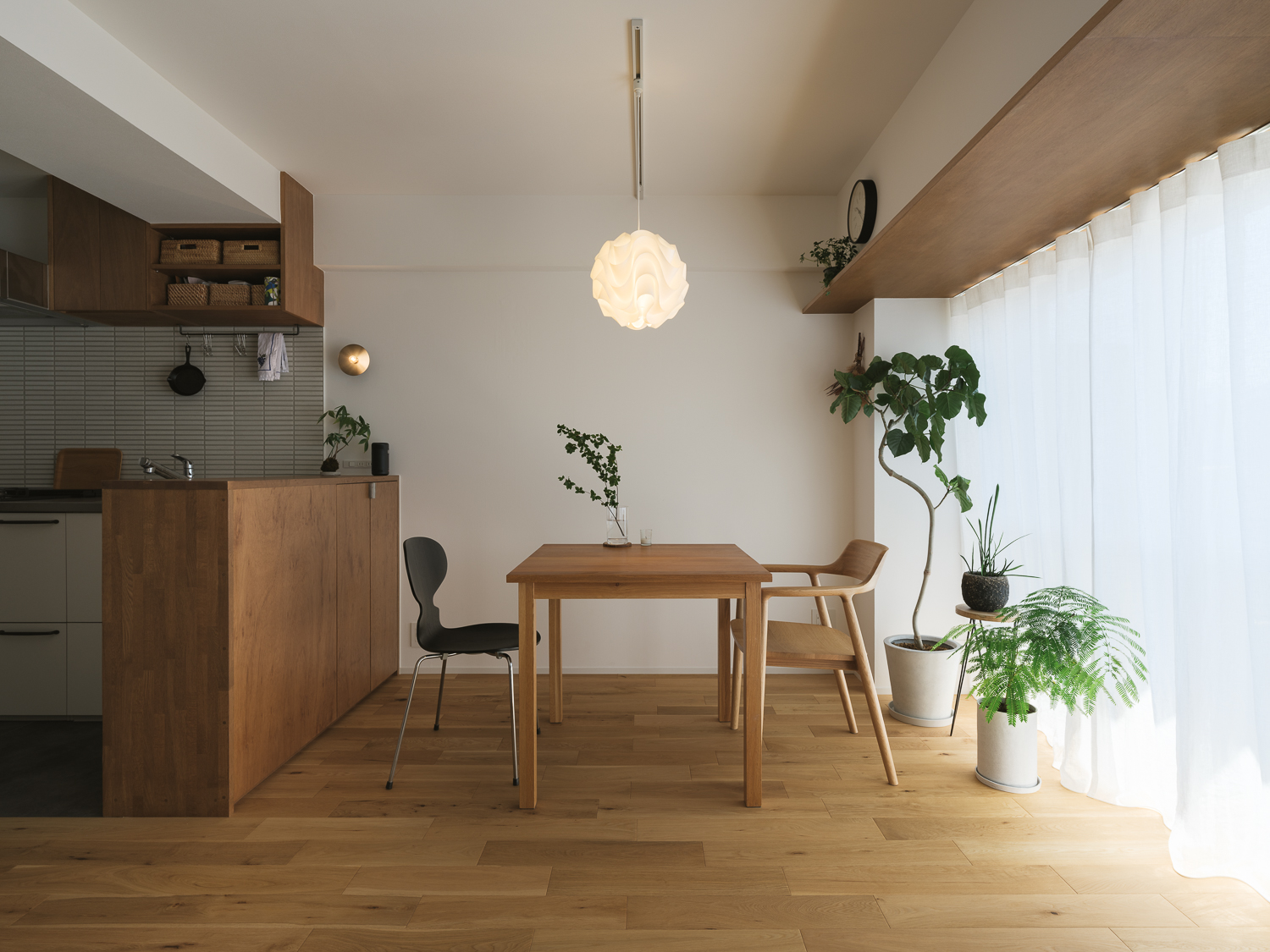 造作のカップボードやライティングレールなど、日々の暮らしに寄り添いながらも、デザインを損なわない繊細な配慮を施しています。